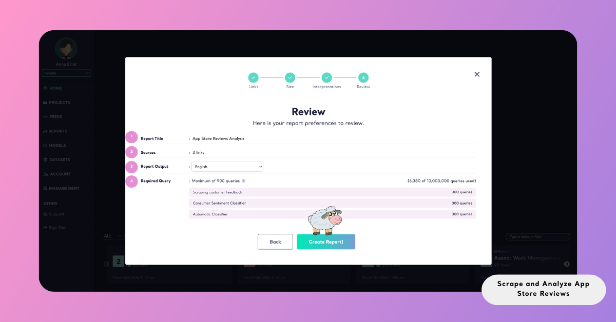 Once the links are confirmed, Kimola collects the available App Store reviews from the selected apps and prepares a dataset that will be used to generate the report.