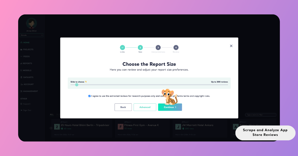 Kimola then prompts you to define how many reviews will be collected and analyzed. Using the slider, you can set the dataset size that will be used to generate the report.