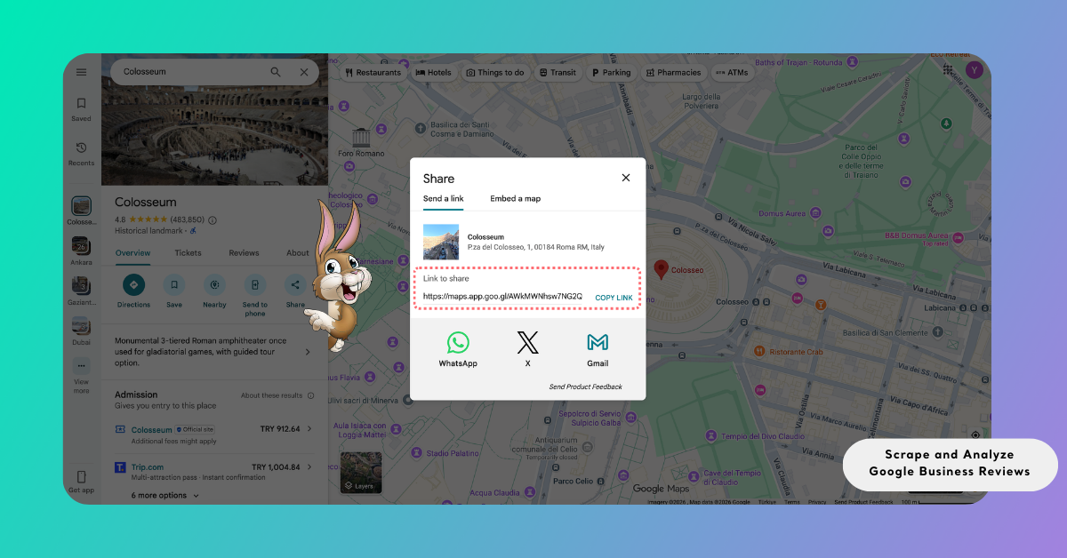 Open Google Maps and search for the business whose reviews you want to analyze. When the business listing appears, open its location panel and select the Share button. A dialog window will appear displaying the shareable business link. Copy the link provided in the Link to share section. This link represents the Google Maps page of the selected business and will be used to collect its reviews.