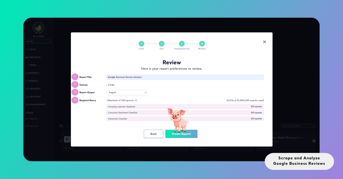 Kimola automates the process of gathering these publicly available reviews and preparing them for analysis within a structured reporting workflow. This enables teams to explore customer feedback at scale without manually collecting or organizing review data.