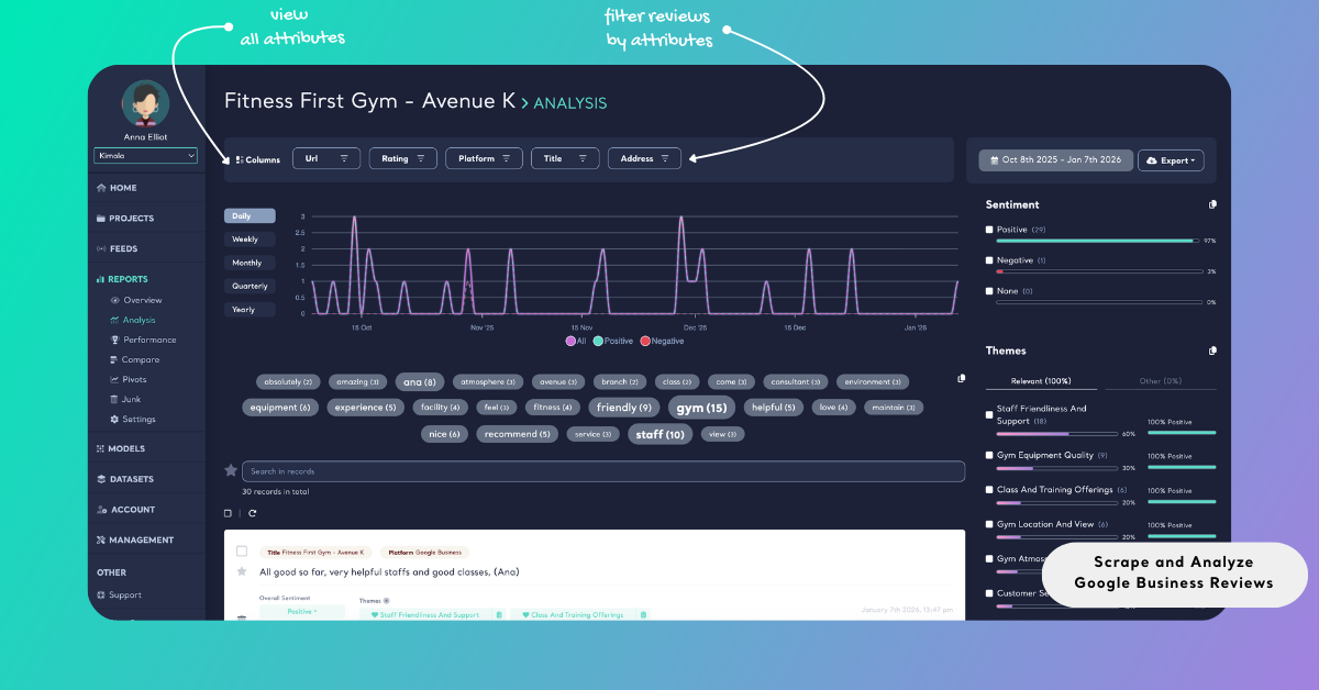 When Google Business reviews are collected automatically, Kimola captures the main fields available on the platform, including review text, rating, date, address, and source URL. These fields can later be used to filter insights by rating level, analyze sentiment trends over time, or identify recurring themes in customer feedback.
