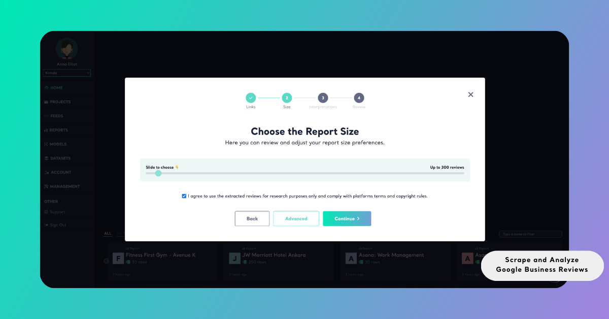 Kimola then prompts you to define how many reviews will be collected and analyzed. Using the slider, you can select the dataset size that will be used to generate the report.