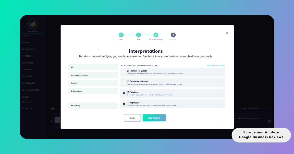 Beyond basic sentiment analysis and standard classifications, Kimola also supports advanced interpretation layers for Google Business reviews. These interpretations help surface broader patterns in customer feedback, such as recurring service problems, expectations expressed by visitors, factors influencing satisfaction, and frequently mentioned complaints.