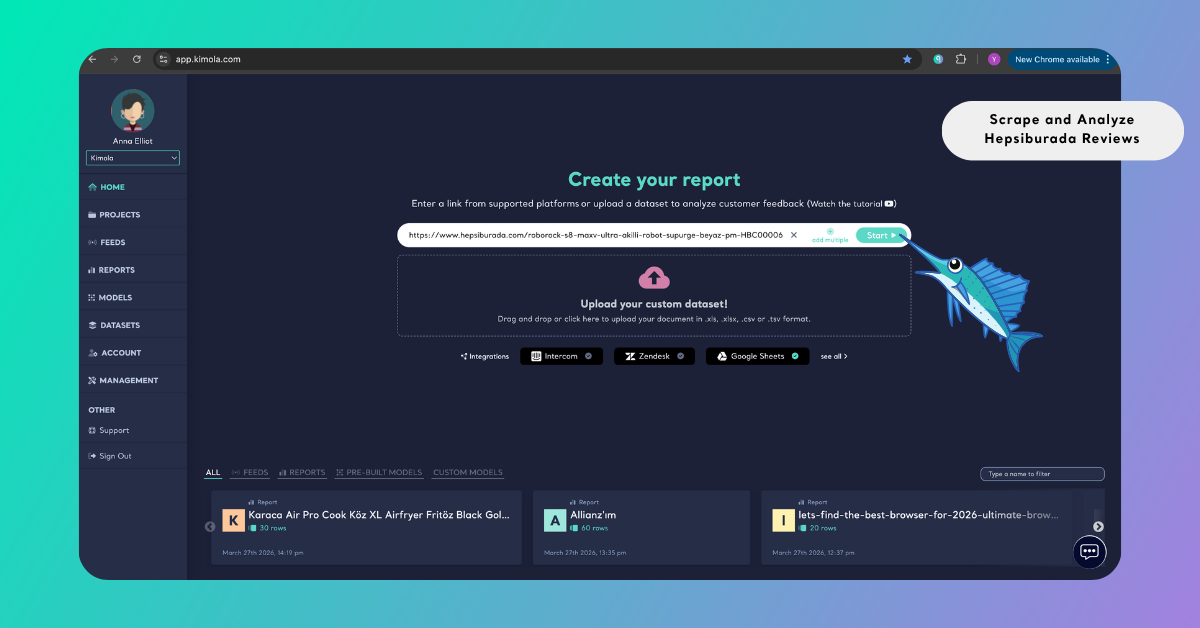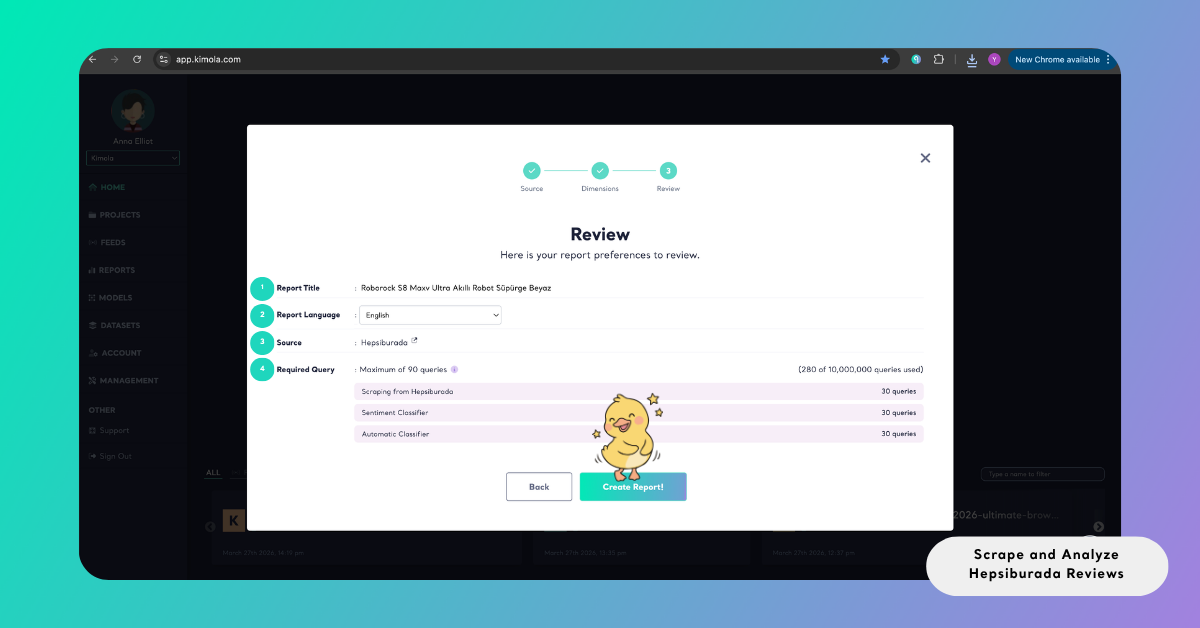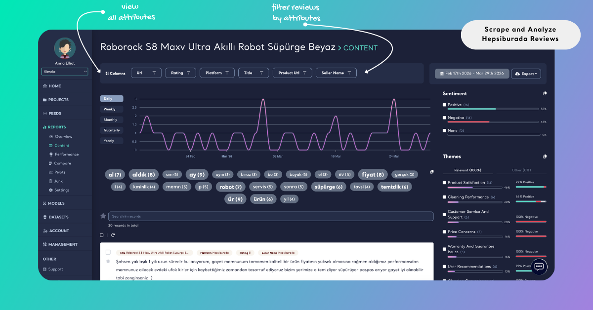With Kimola, you can collect and analyze Hepsiburada reviews through a fully automated workflow. By simply entering a product link, the platform handles data collection, dataset creation, and analysis in a single flow — eliminating the need for manual preparation or technical setup.