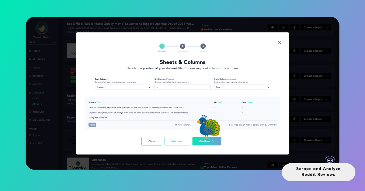 This action starts Kimola’s standard report creation workflow. Select the column that contains the main text (posts and comments), and optionally include additional fields such as date or URL if they are available. These selections define how your dataset will be structured and processed during analysis.