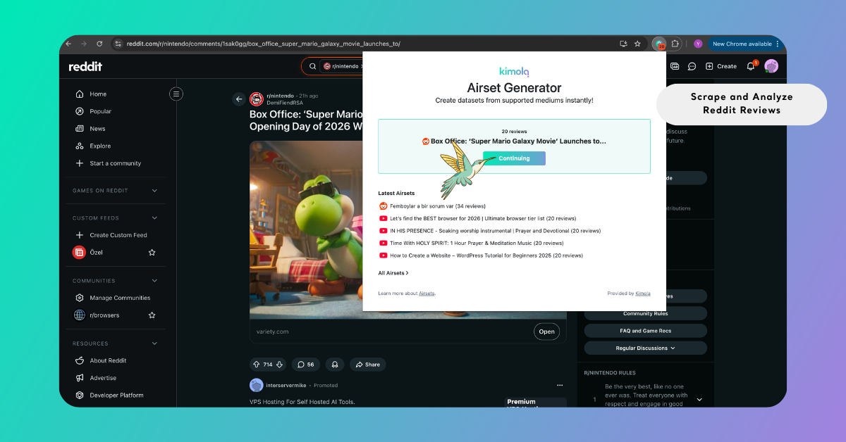 Manual scraping allows you to collect Reddit posts and comments directly while browsing, using Kimola’s browser extension. Instead of relying on structured review pages, this workflow lets you capture discussions in real time from threads and comment sections.