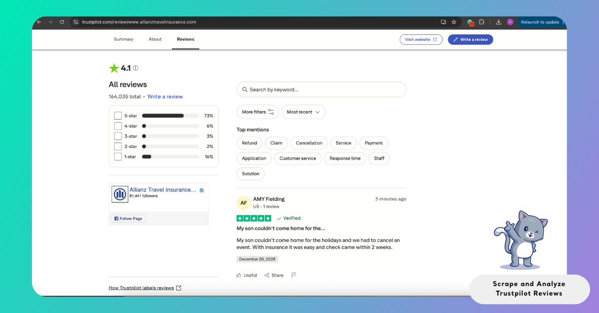 Automatic scraping allows you to analyze Trustpilot reviews by simply entering a company profile link, without manually collecting reviews or preparing a dataset in advance.