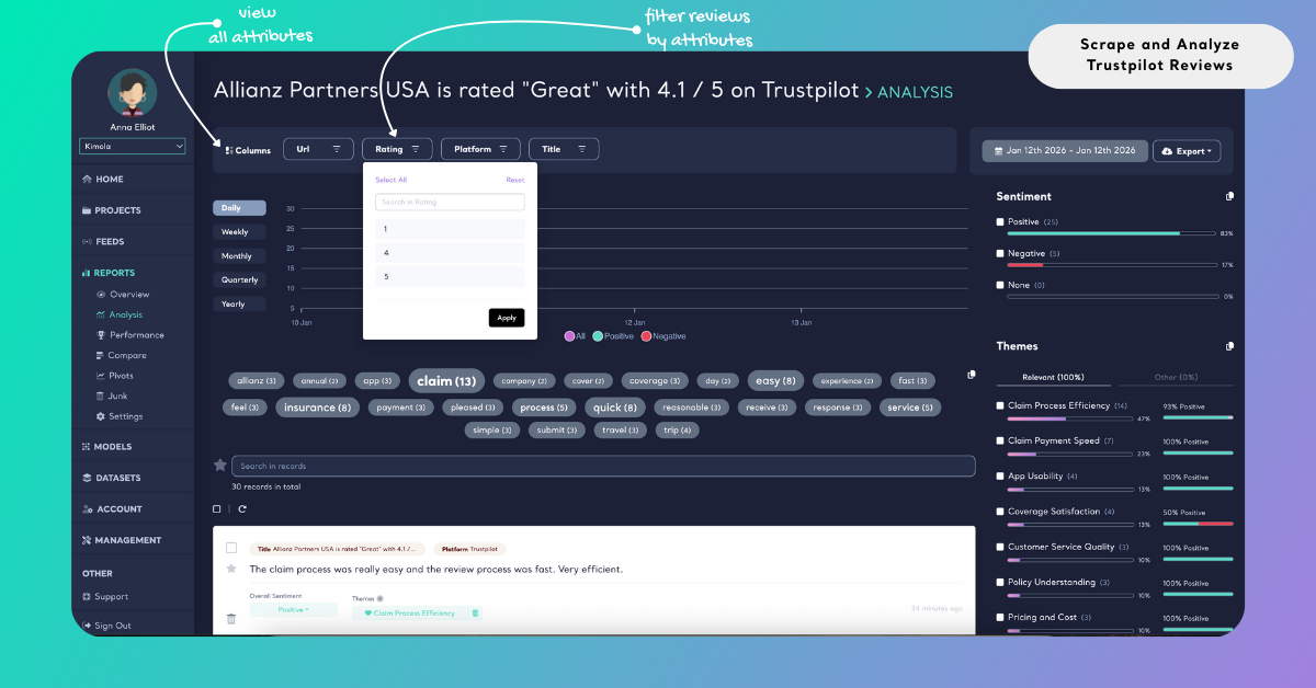 Beyond standard sentiment analysis and classifications, Kimola allows you to apply higher-level interpretations to Trustpilot reviews. These interpretations help surface patterns such as customer pain points, experience gaps, loyalty indicators, and trust-related themes.