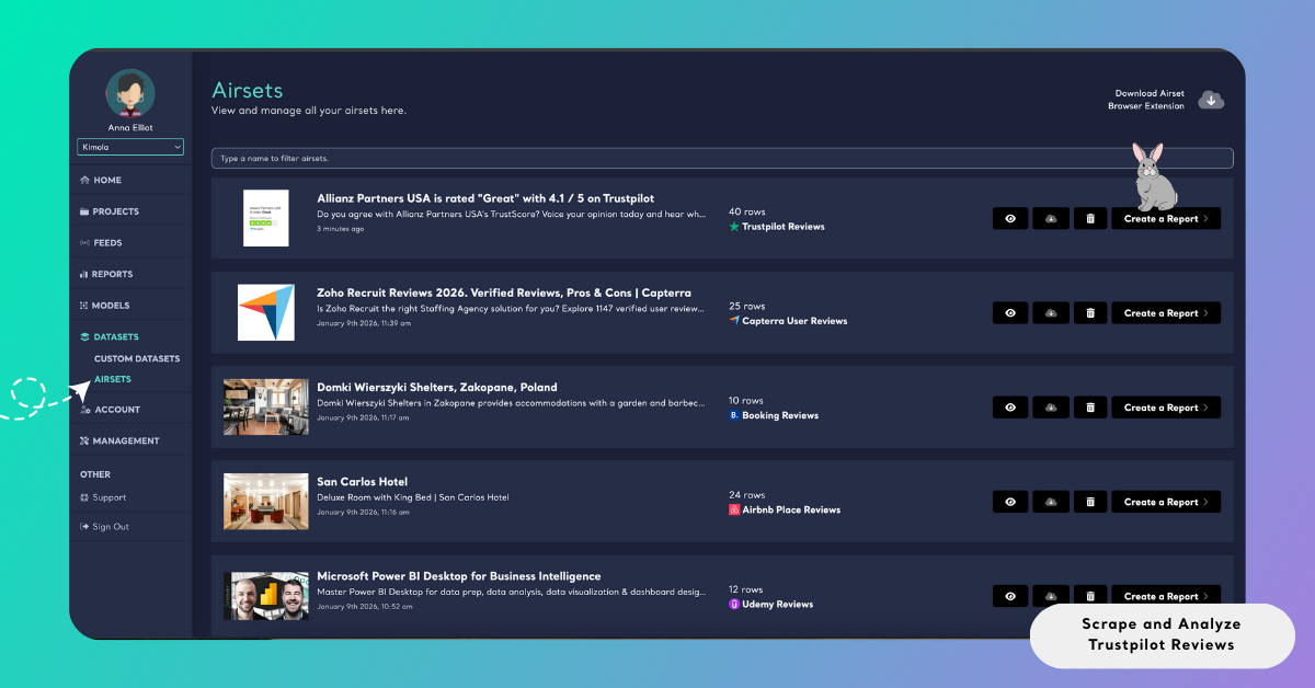 Reviews collected through the extension are stored as Airsets in your Kimola account. An Airset represents a dataset that can be collected first and analyzed later. This workflow is useful when reviews are gathered across multiple sessions, from different companies, or as part of a longer research process. Once data collection is complete, you can create a report from the Airset and apply the same analysis workflow used for link-based reports.
