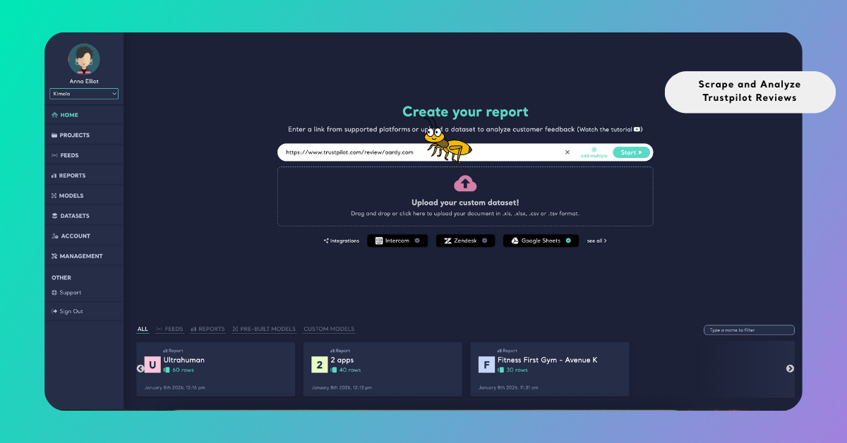 When a Trustpilot company URL is added, Kimola automatically detects the platform, collects publicly available reviews from the page, and builds a dataset in the background. The selected analyses are then applied to the data, and the report is generated through Kimola’s standard workflow. This approach is ideal when you want to quickly analyze customer feedback or compare multiple companies using the same methodology.