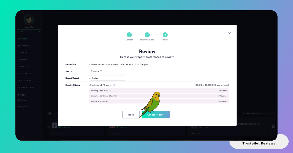 Kimola then prompts you to define how many Trustpilot reviews will be collected and analyzed. Using the slider, you can specify the target dataset size for the report.