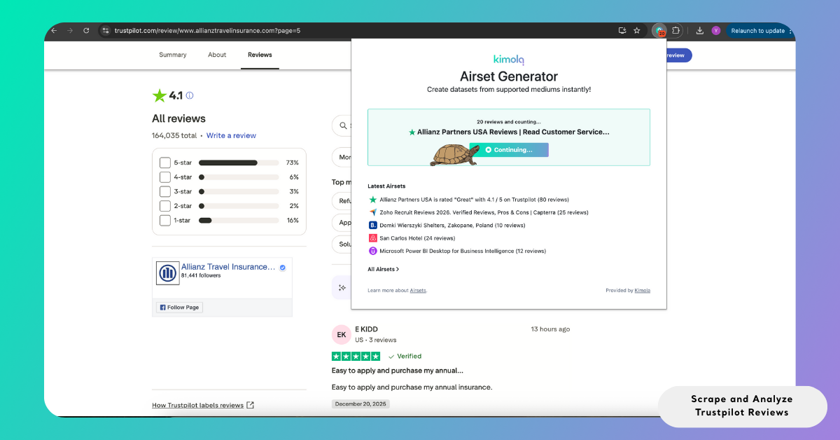 Manual scraping is an alternative way to collect Trustpilot reviews when you prefer to gather data through direct interaction with the platform. Instead of starting from a company link inside Kimola, reviews are captured while browsing Trustpilot company pages using Kimola’s browser extension, Airset Generator.