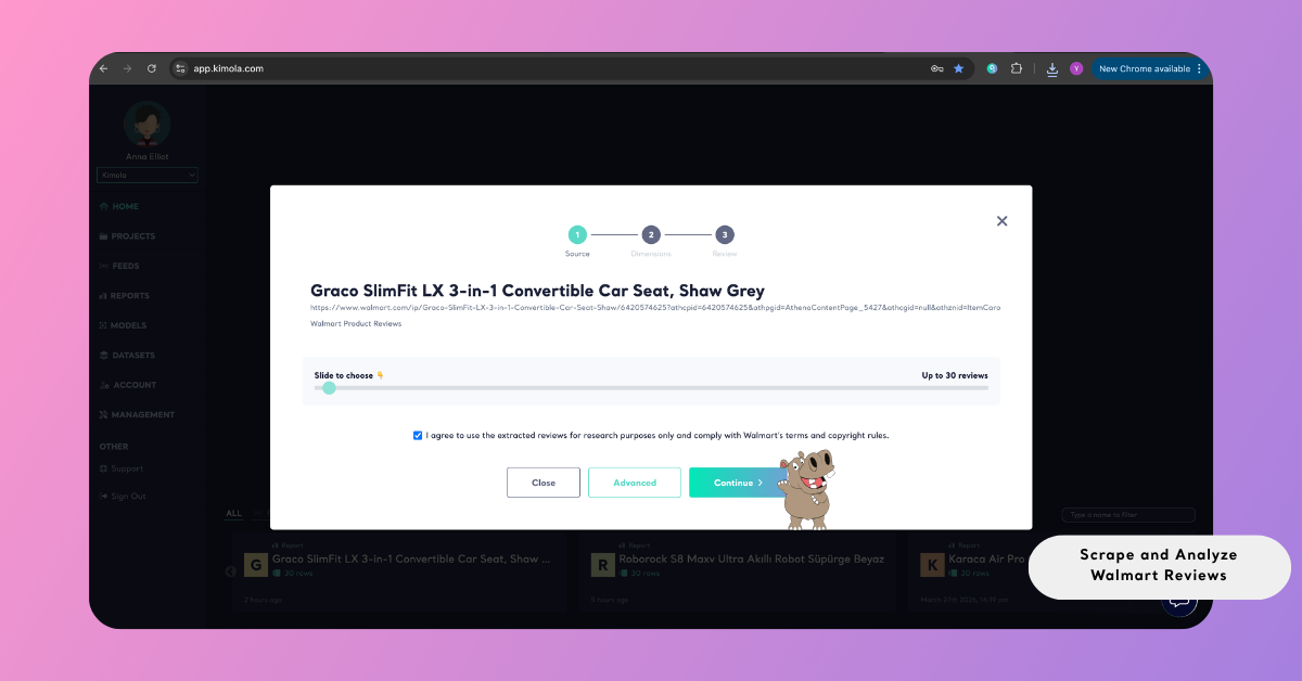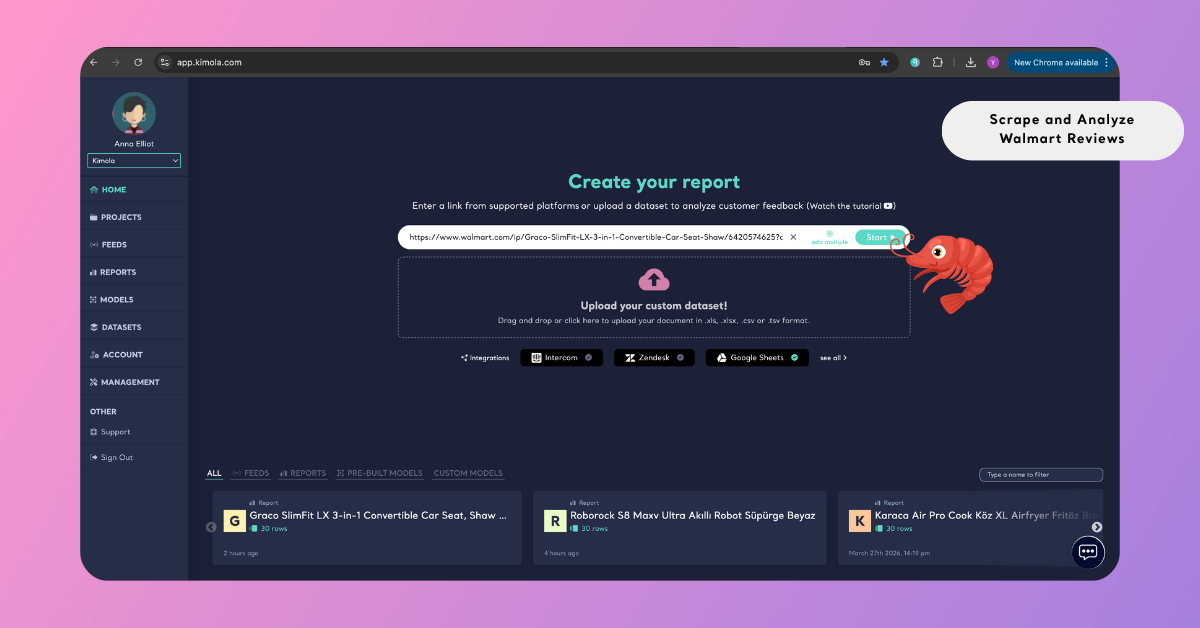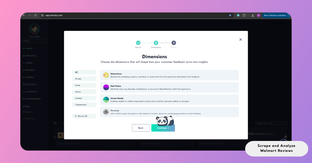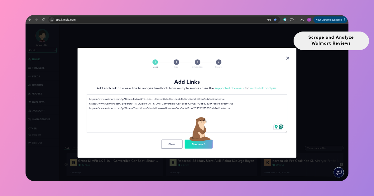 Turning this large and unstructured feedback into clear insight requires a systematic approach. With Kimola, you can collect and analyze Walmart reviews through a fully automated workflow. By simply entering a product link, the platform handles data collection, dataset creation, and analysis in a single flow.