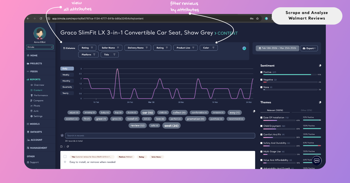 You can also create a Feed to track Walmart reviews over time and receive regular reports and alerts in Kimola.