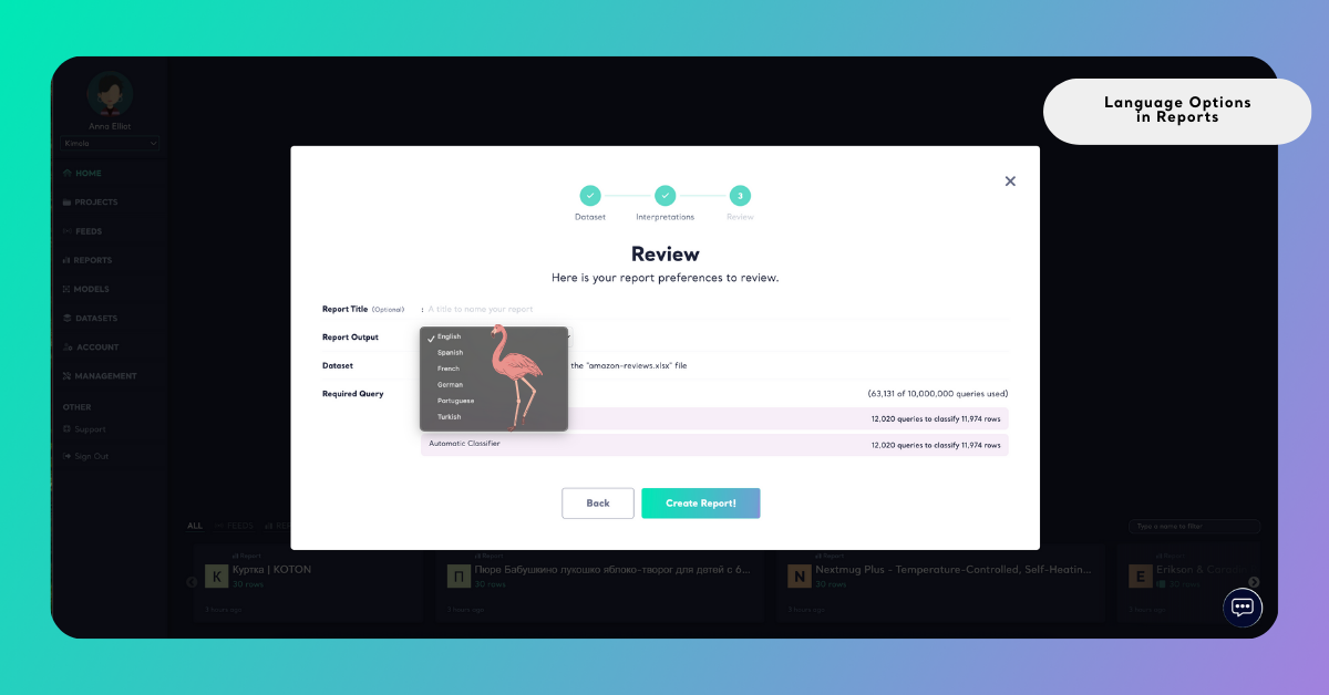 If your feed collects reviews in multiple languages but your stakeholders expect insights in English, you can set the report language to English. Kimola will present summaries, interpretations, and insights in English while keeping the original reviews unchanged.