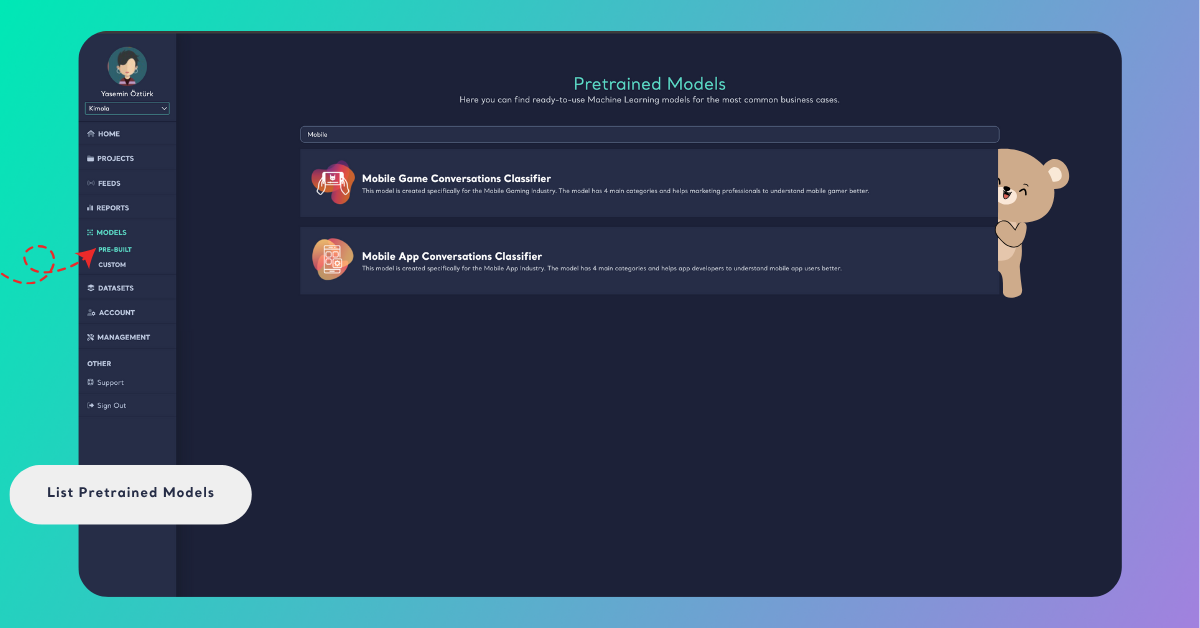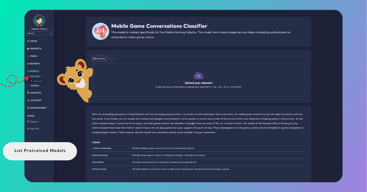 Typing “Mobile” will instantly display all pretrained models related to mobile products, such as Mobile App Feedback Classifier or Mobile Game Feedback Classifier.