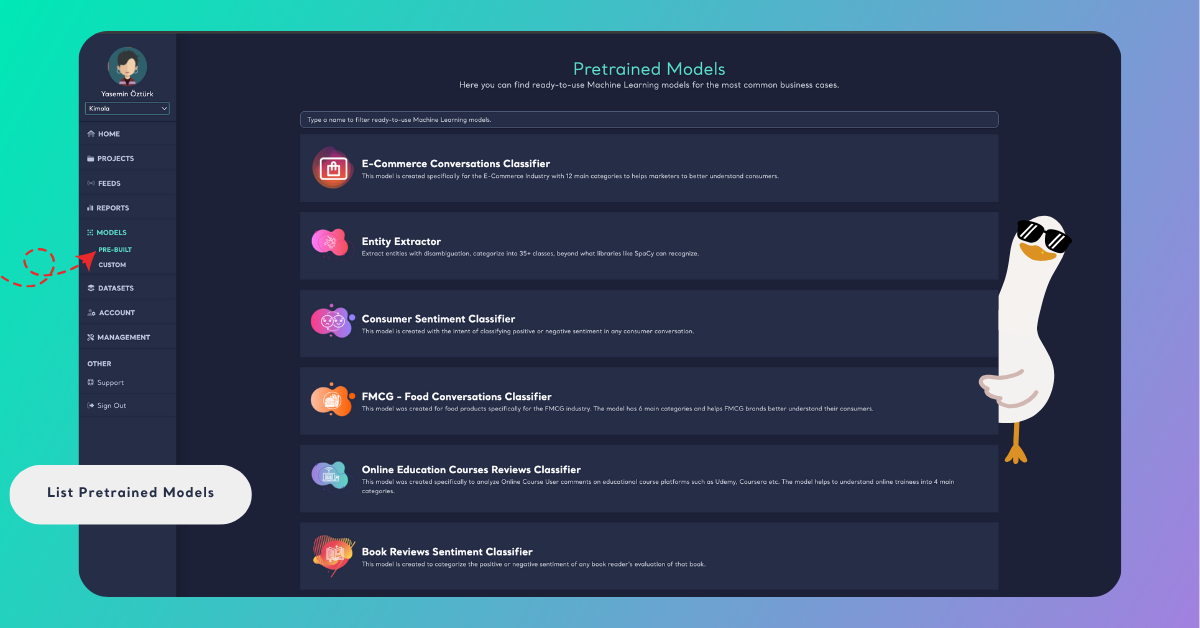 2 mins read - Updated on Oct 28, 2025Pretrained models serve as a centralized hub where you can explore a variety of pre-built AI models tailored for diverse industries. These ready-to-use models are crafted by the Kimola team to address common business scenarios, saving you time and effort in developing your own solutions. Follow these easy steps to access and navigate the gallery.