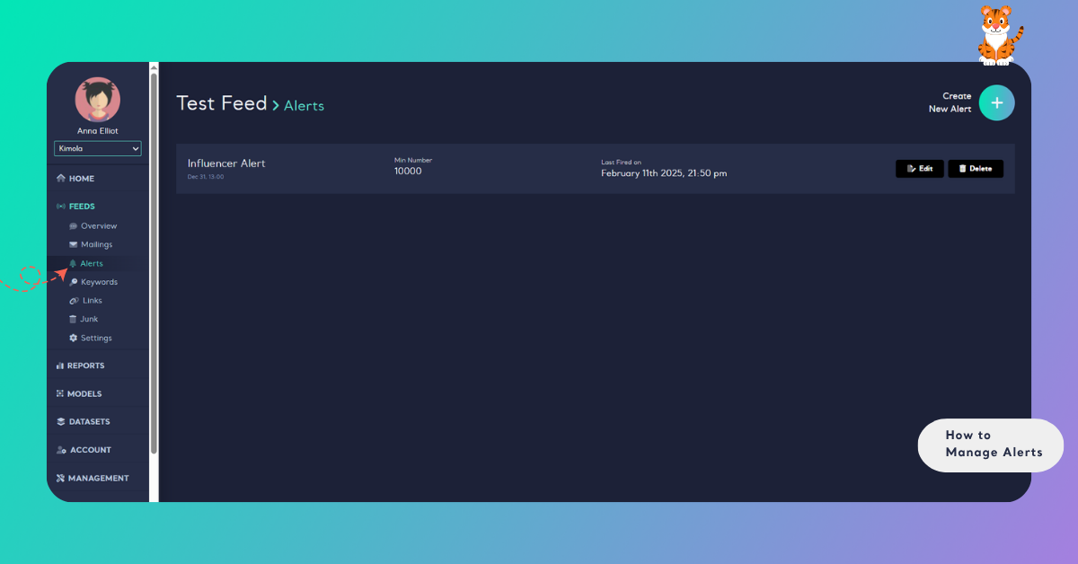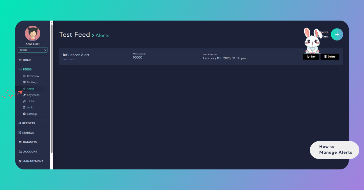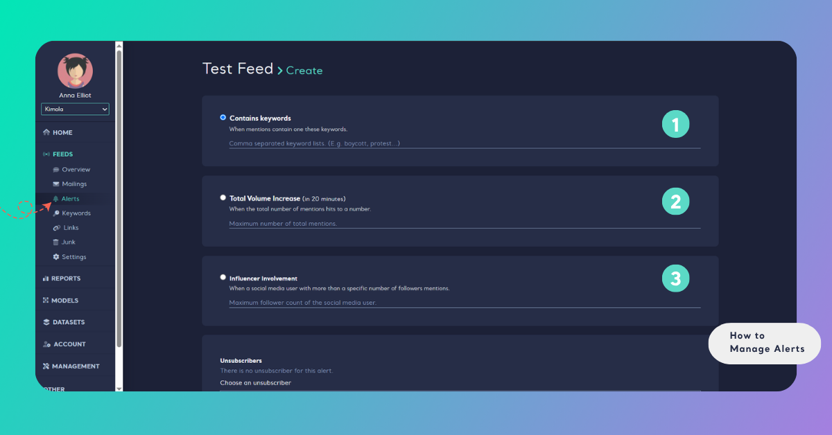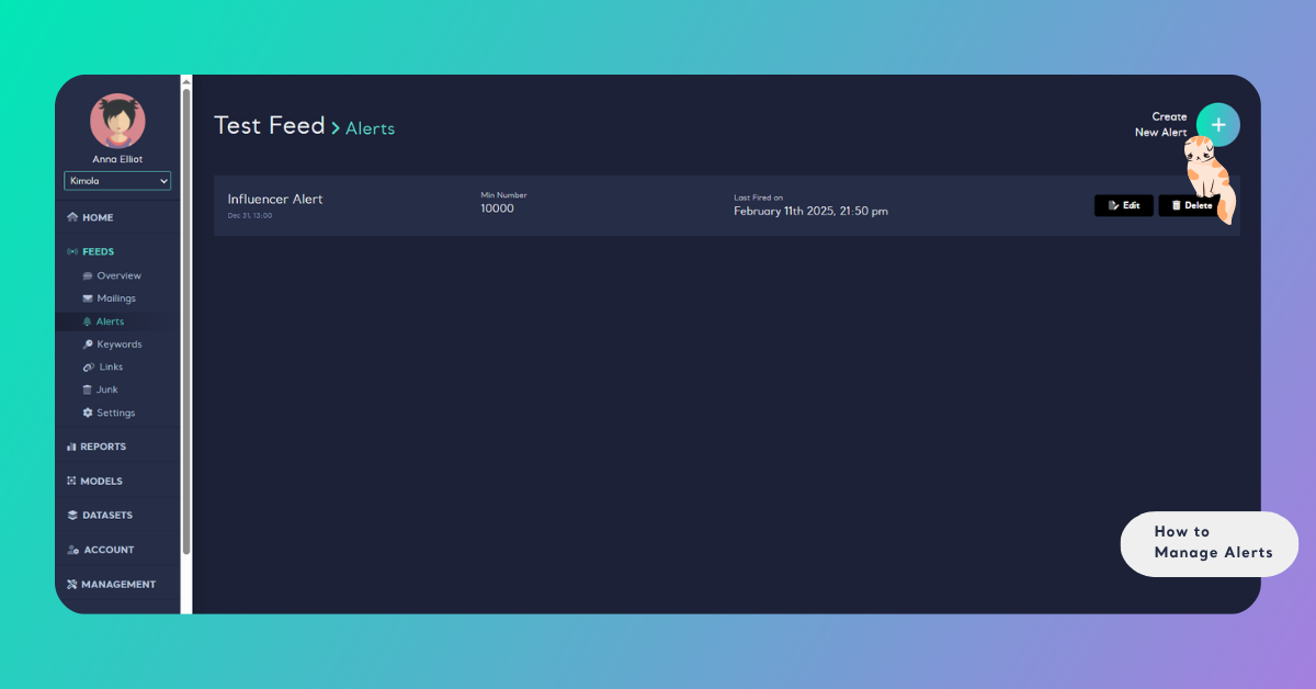 Sign in to your Kimola account, go to the Feeds menu, select a feed, open Alerts from the left panel, and click Create New Alert to start a new one or add another if alerts already exist.