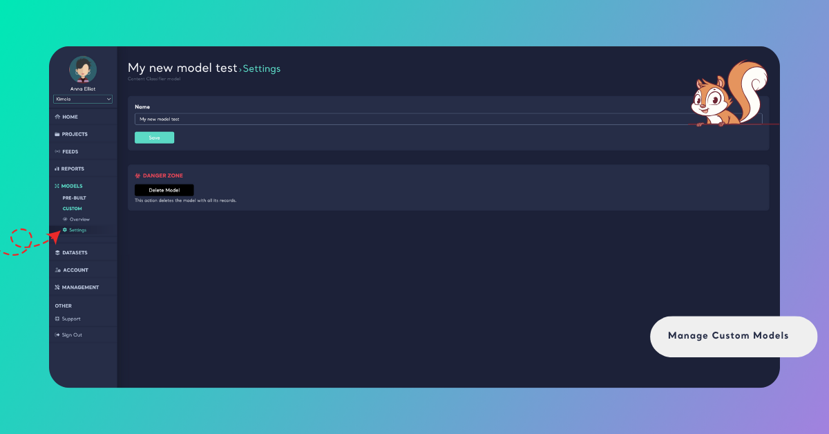 Once you’ve created your Custom AI Models in Kimola, you can easily manage them from your dashboard. Managing your models effectively helps you keep your workspace organized, make updates when needed, and remove unused models to maintain efficiency.