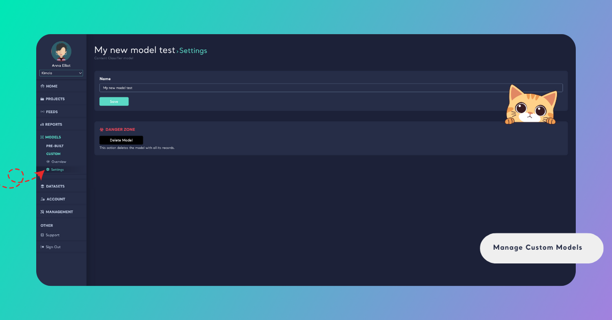 To manage your custom models, sign in to your Kimola account and open your dashboard. From the left panel, click Models, then choose the Custom tab to view all your Custom AI Models. Select the model you want to manage and go to its Model Settings page.