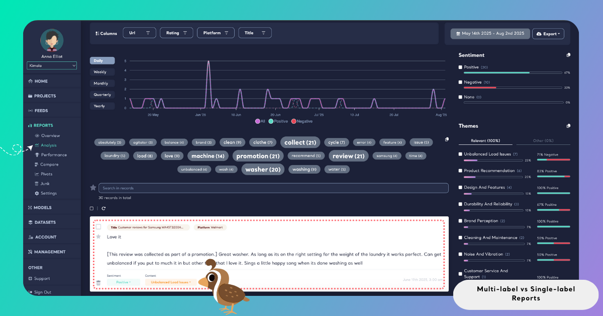 When analyzing customer feedback, not all datasets behave the same way. Some records focus on a single topic, while others naturally cover multiple themes within the same comment. Kimola supports both multi-label and single-label reporting structures, allowing you to choose the approach that best fits your analysis goals.