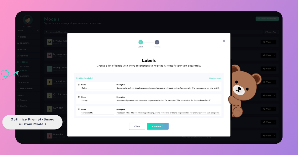 3 mins read - Updated on Oct 27, 2025Prompt-based Custom Models in Kimola let you build AI models without uploading a dataset — simply by defining labels and describing what each one means. However, the way you write your labels, descriptions, and prompt has a major impact on your model’s accuracy and consistency.