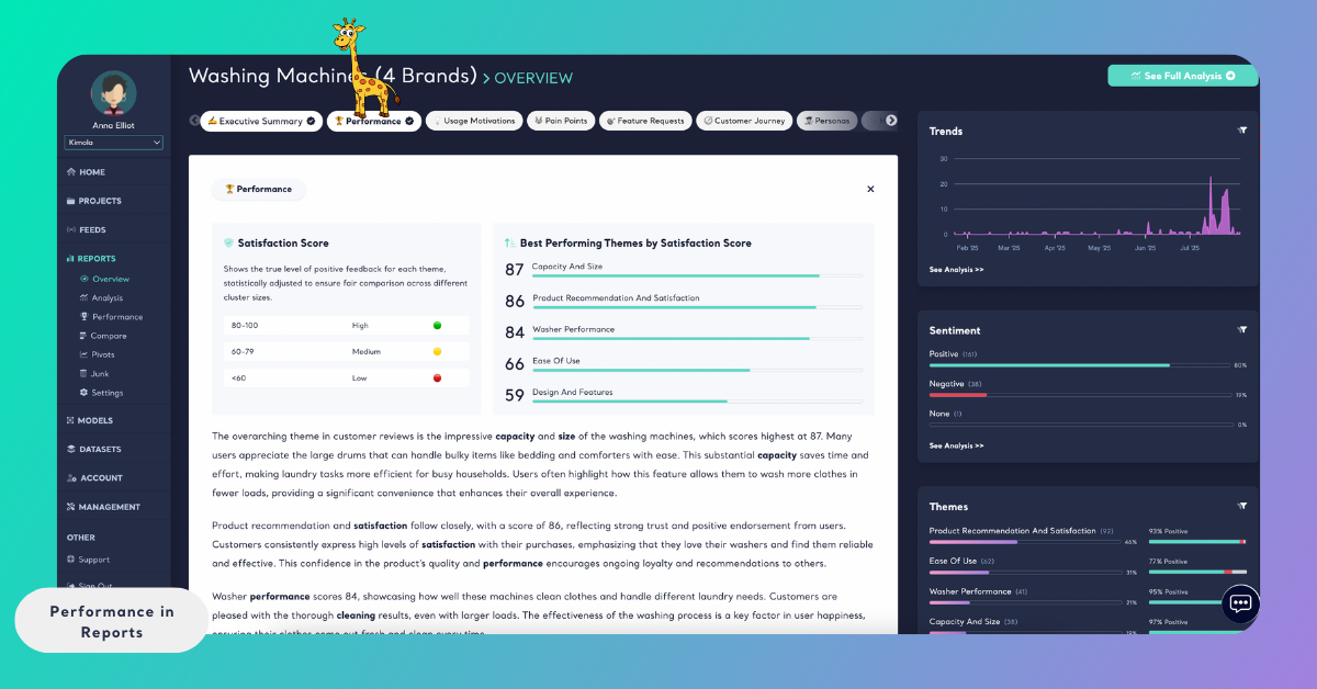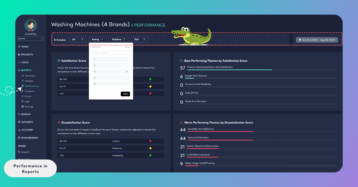 Performance is generated automatically as part of the report analysis. Once the data is collected and analyzed, Kimola calculates performance scores for themes based on both sentiment distribution and review volume. This allows performance metrics to be explored without any additional setup.