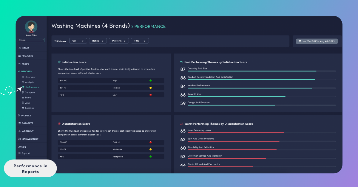 4 mins read - Created on Sep 22, 2025Performance is a metric in Kimola that helps you identify which themes have the greatest impact on customer satisfaction. It evaluates feedback by considering both sentiment and volume, so insights reflect not only how customers feel, but also how frequently those topics appear.