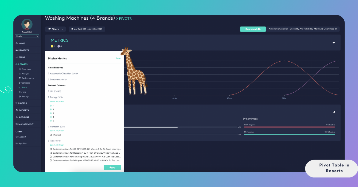 In Kimola, a report is where collected data is analyzed after data collection is completed. Pivot tables work directly on this analyzed report data, which means you can interactively explore insights using existing analysis outputs—such as sentiment and filters—without creating a new report or re-running analysis.