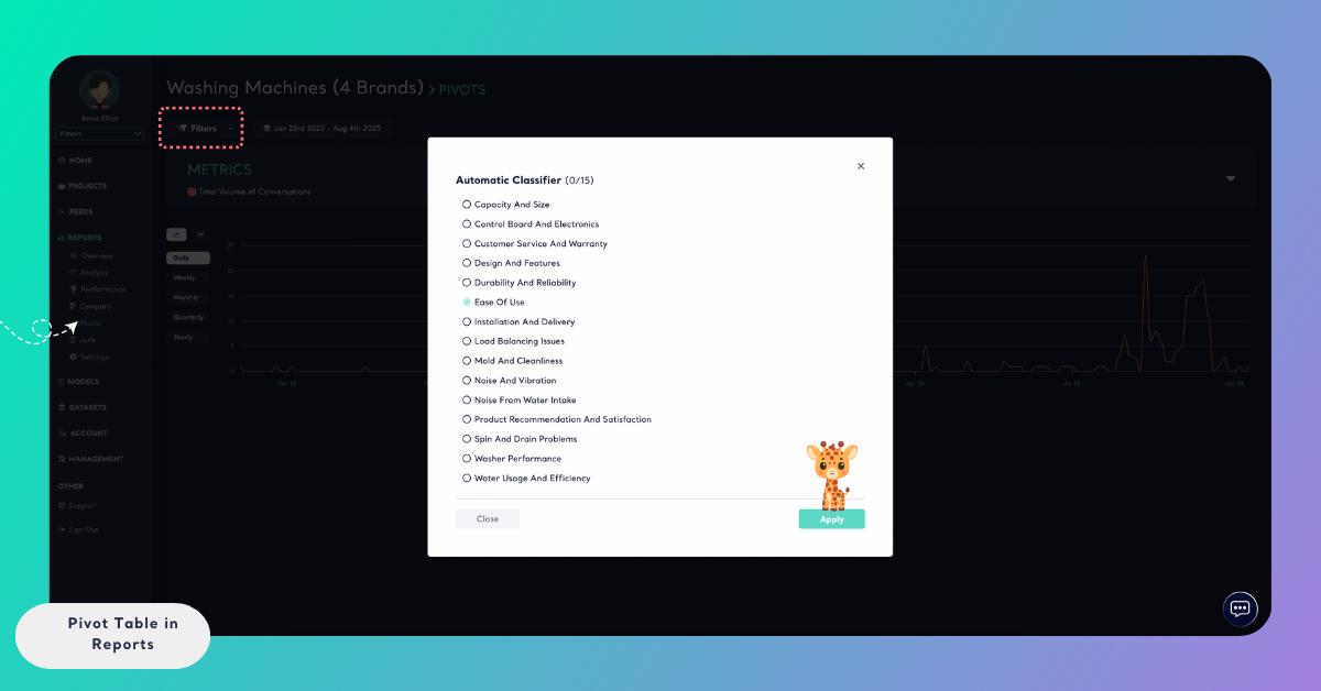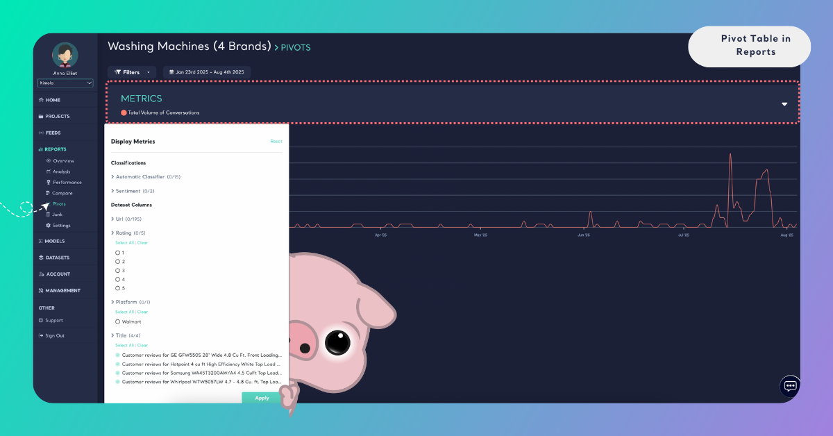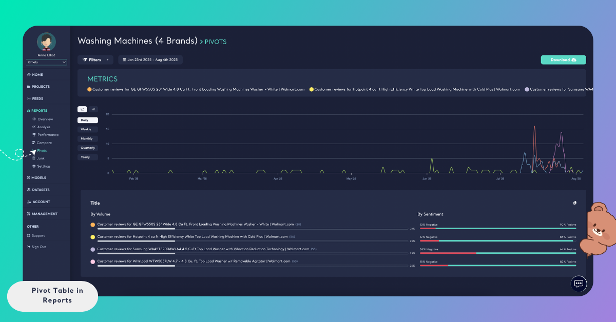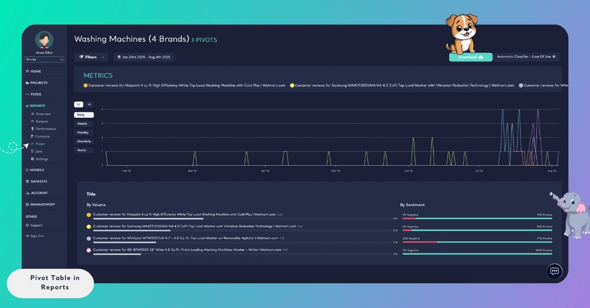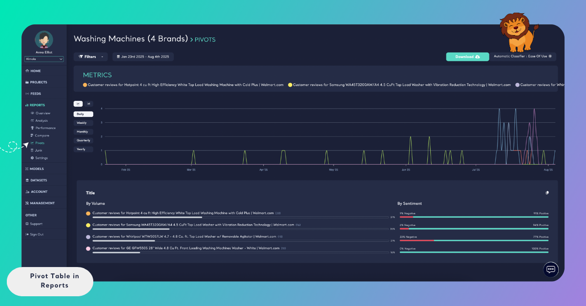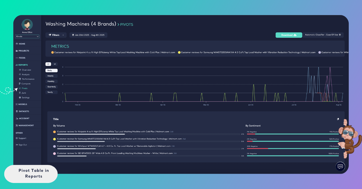 You can also apply a date range filter to analyze how a metric’s volume and sentiment change over a specific time period. Pivot tables automatically update to reflect the selected date range and filters.
