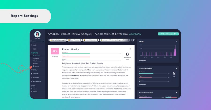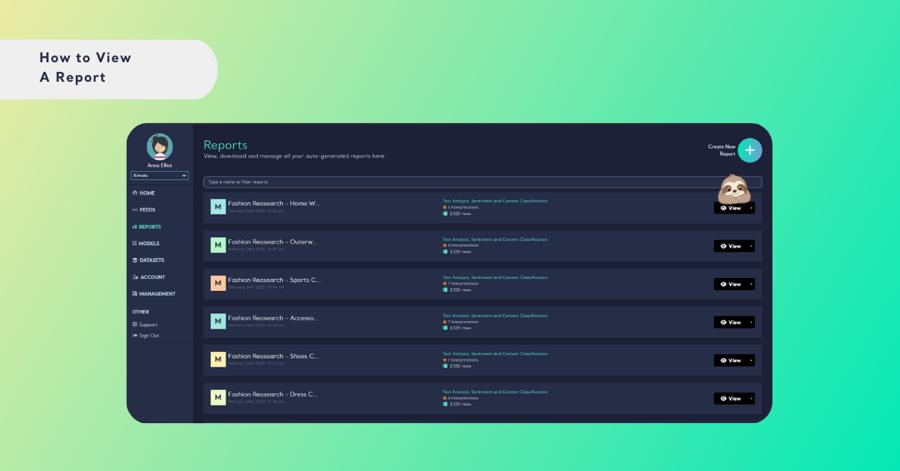 Start by logging into your Kimola Dashboard and heading to the reports page. Select the specific report you wish to edit by clicking on its title, icon, or “View” button. Once inside the report, navigate to the "Settings" page via the menu on the left panel to access all customization options.