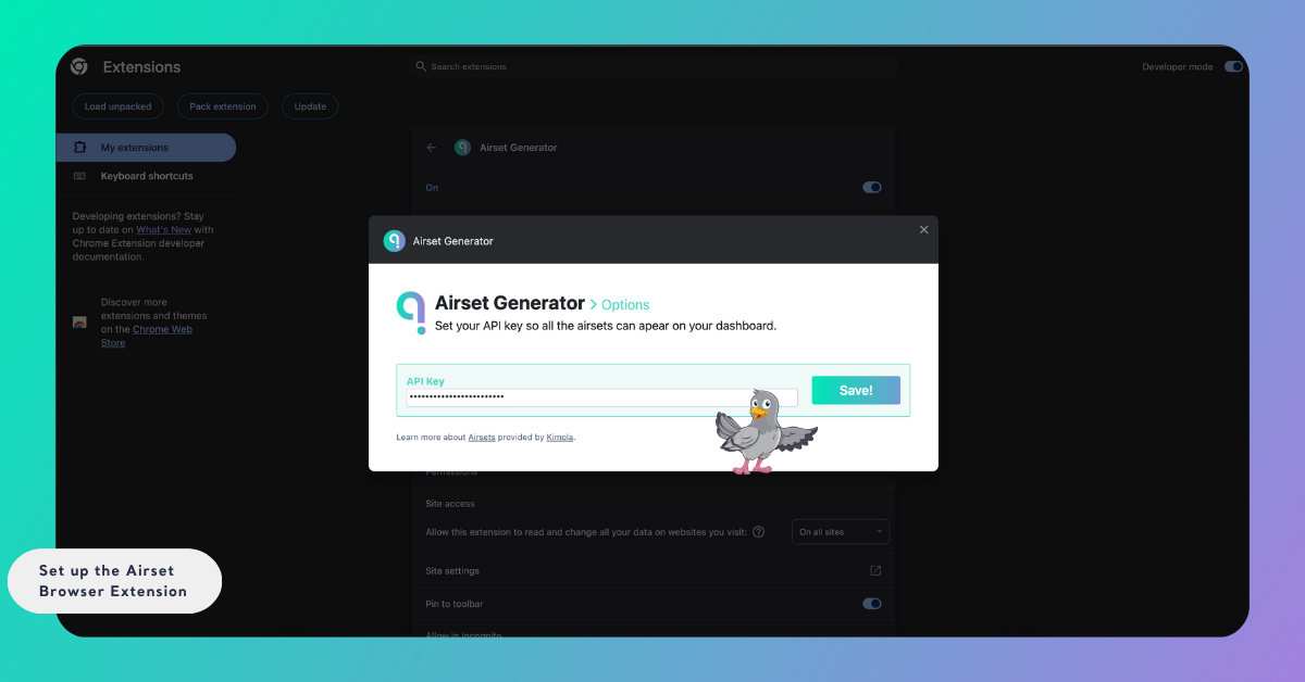 - You’ll be prompted to enter your API Key to connect the extension to your Kimola account.