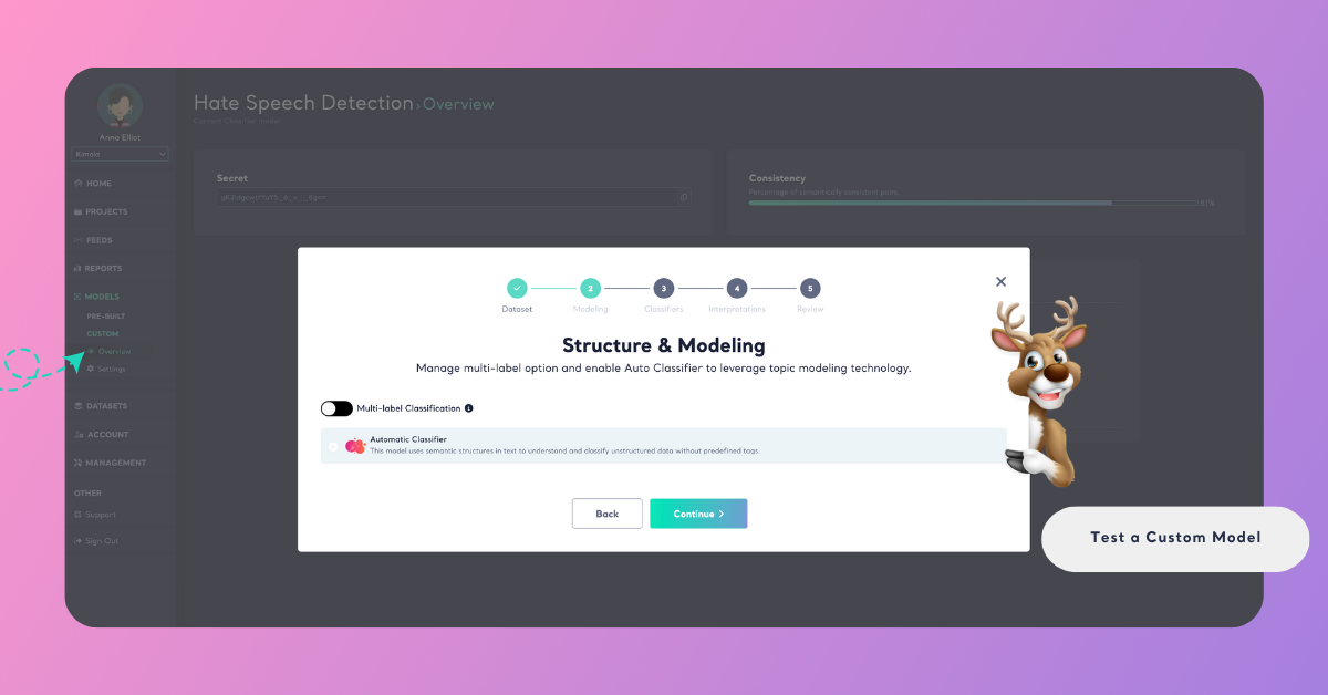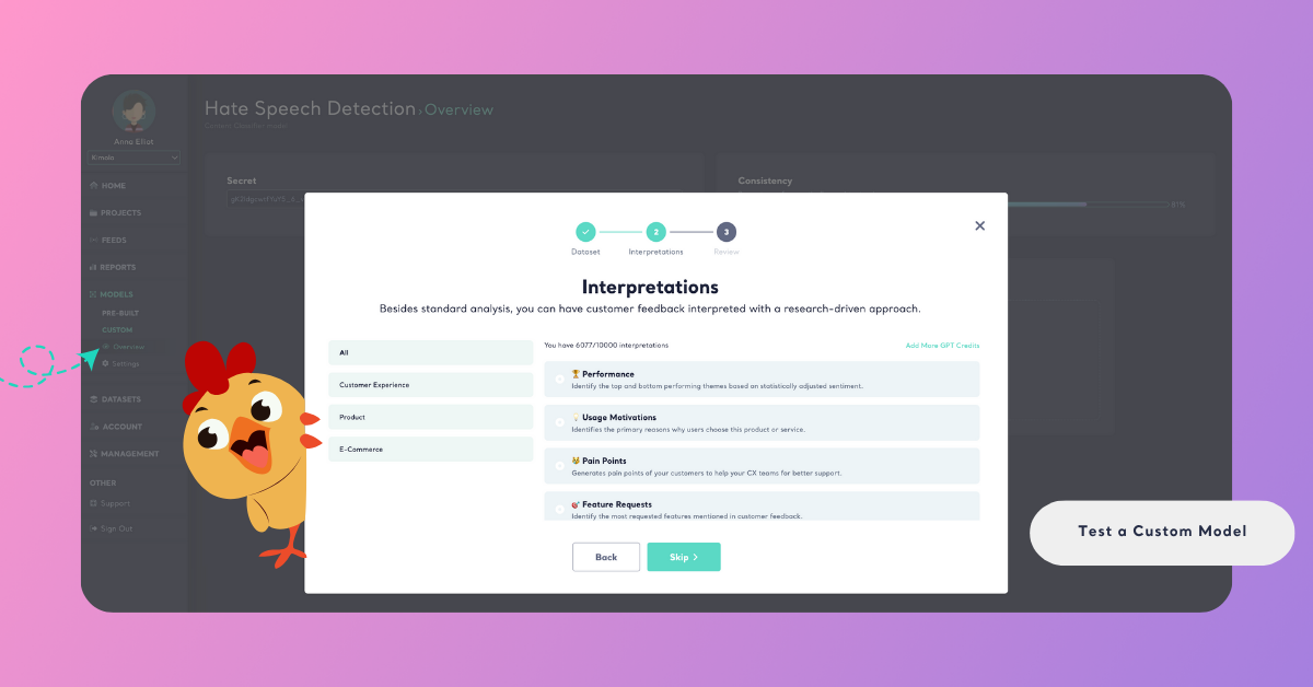 To analyze your data only with the selected Custom Model, click Advanced and uncheck Automatic Classifier. The Automatic Classifier is Kimola’s ready-to-use feature that classifies customer feedback automatically — without any setup, manual labelling, or training. It’s fast and error-free, but turning it off ensures that your test runs purely with your own trained model.