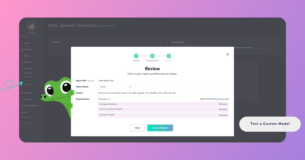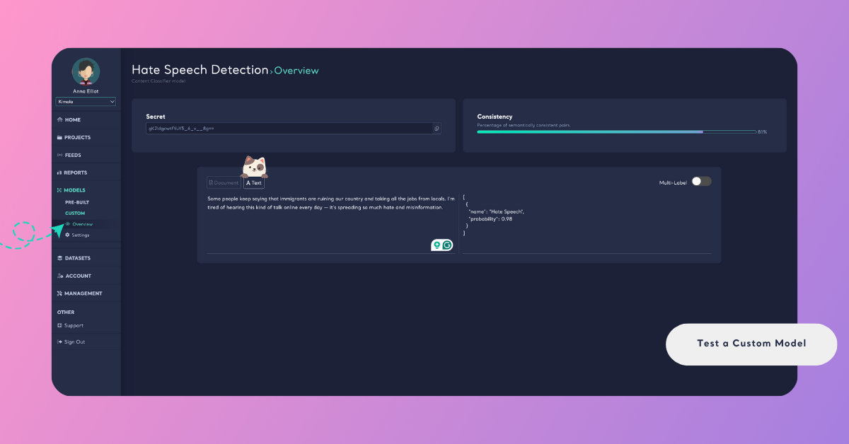 Sign in to your Kimola account and go to the Models section on the left panel. Select the Custom tab and click on the model you want to test.