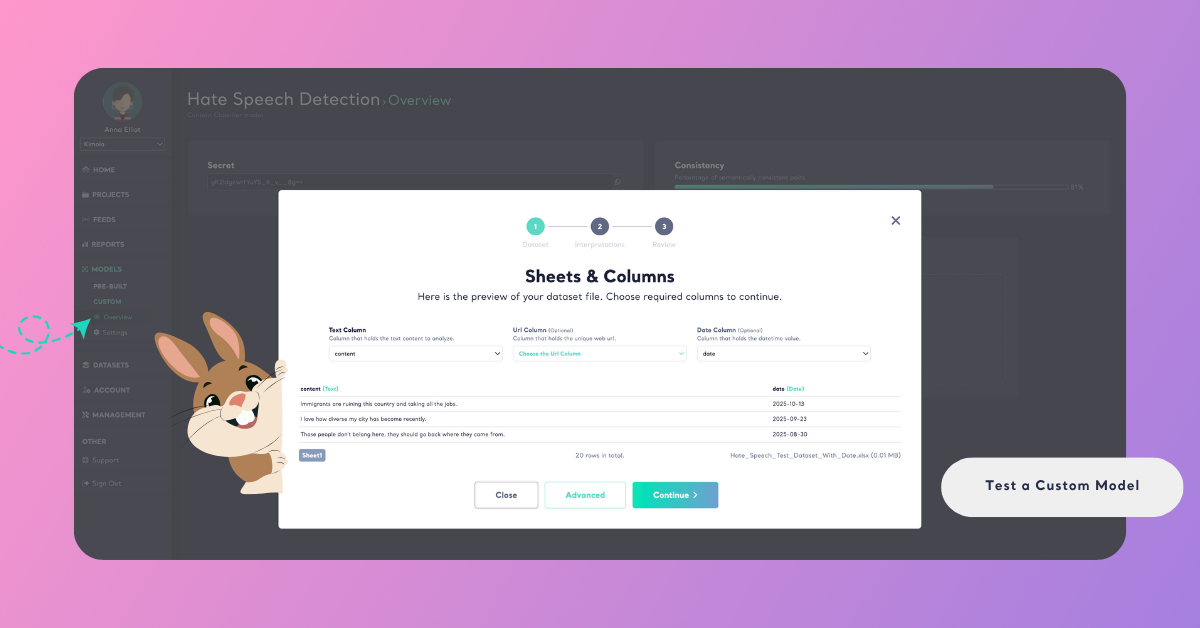 After creating your model, you can test it directly in Kimola to see how it performs before using it in large-scale analysis. Testing helps you verify whether your model correctly classifies text based on your labels and ensures it’s ready for real datasets. You can test a model by manually entering text or by uploading a document for batch testing.