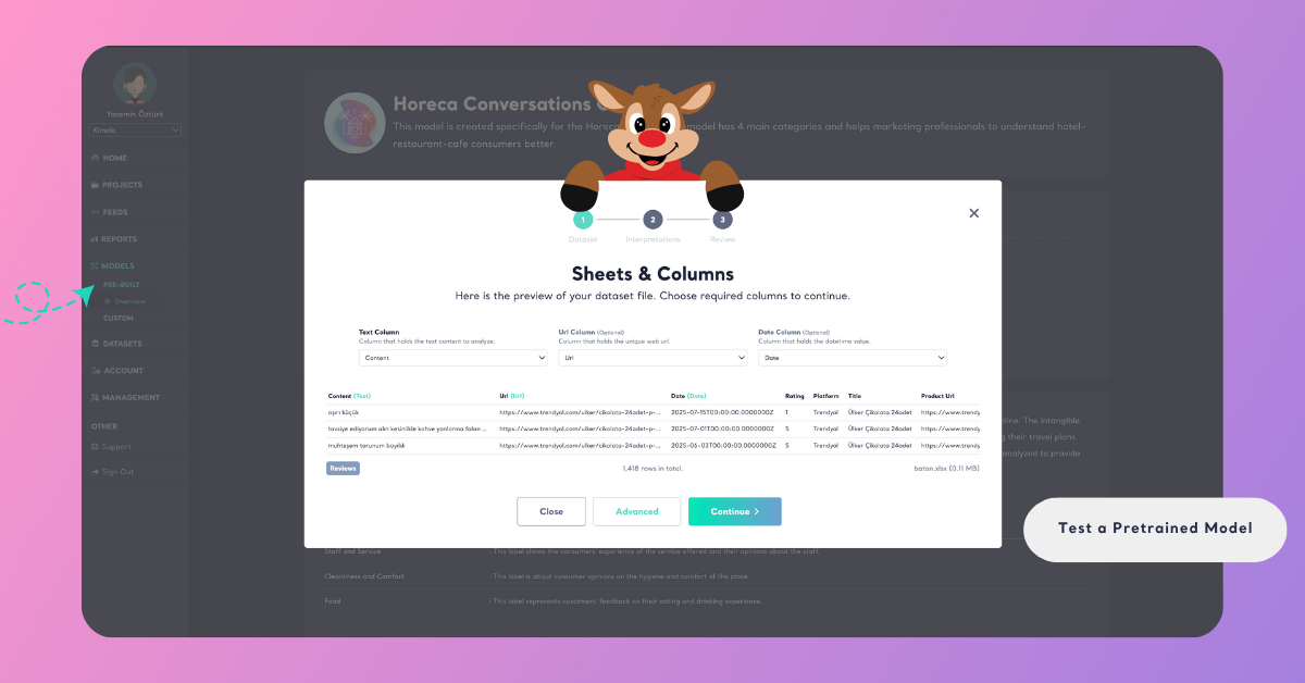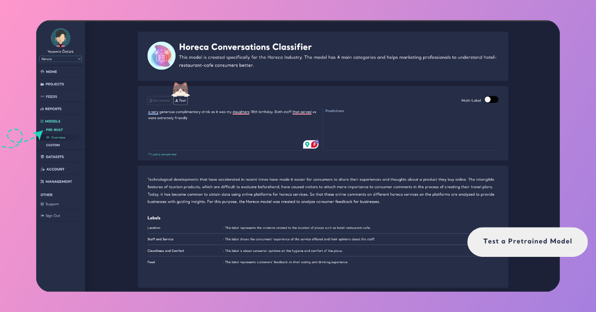 4 mins read - Updated on Oct 28, 2025A Pretrained Model is an AI model already created and trained by Kimola for specific industries such as E-Commerce, Banking, Automotive, Telecommunications, and more. Unlike Custom Models, pretrained models are ready to use — there’s no need for manual labeling or training.