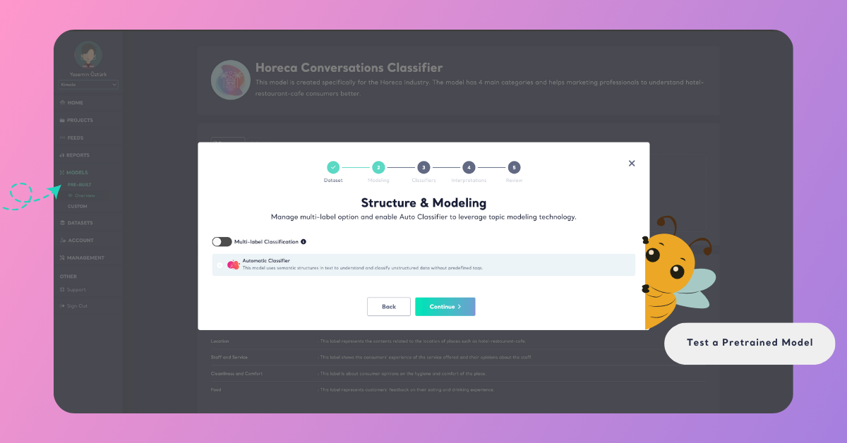 The Automatic Classifier is Kimola’s built-in AI that automatically classifies customer feedback without any setup or training. Disabling it ensures the results come only from the pretrained model you selected.