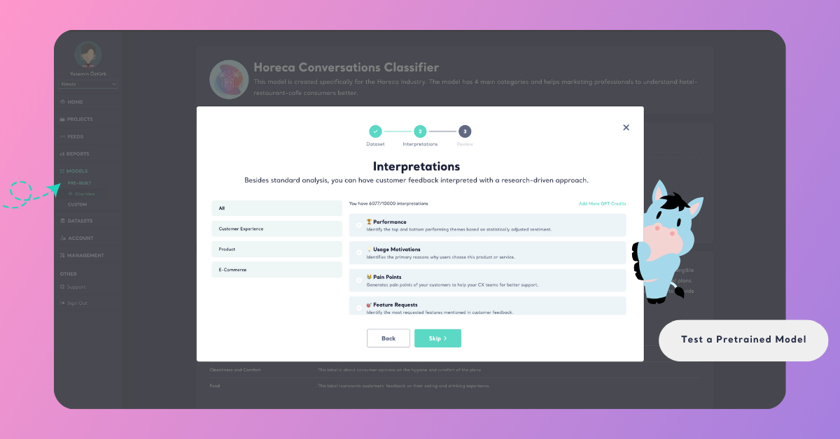 In the Interpretations step, you can add extra layers of analysis to enrich your results. Besides standard classification, you can have customer feedback interpreted with a research-driven approach — uncovering deeper insights.