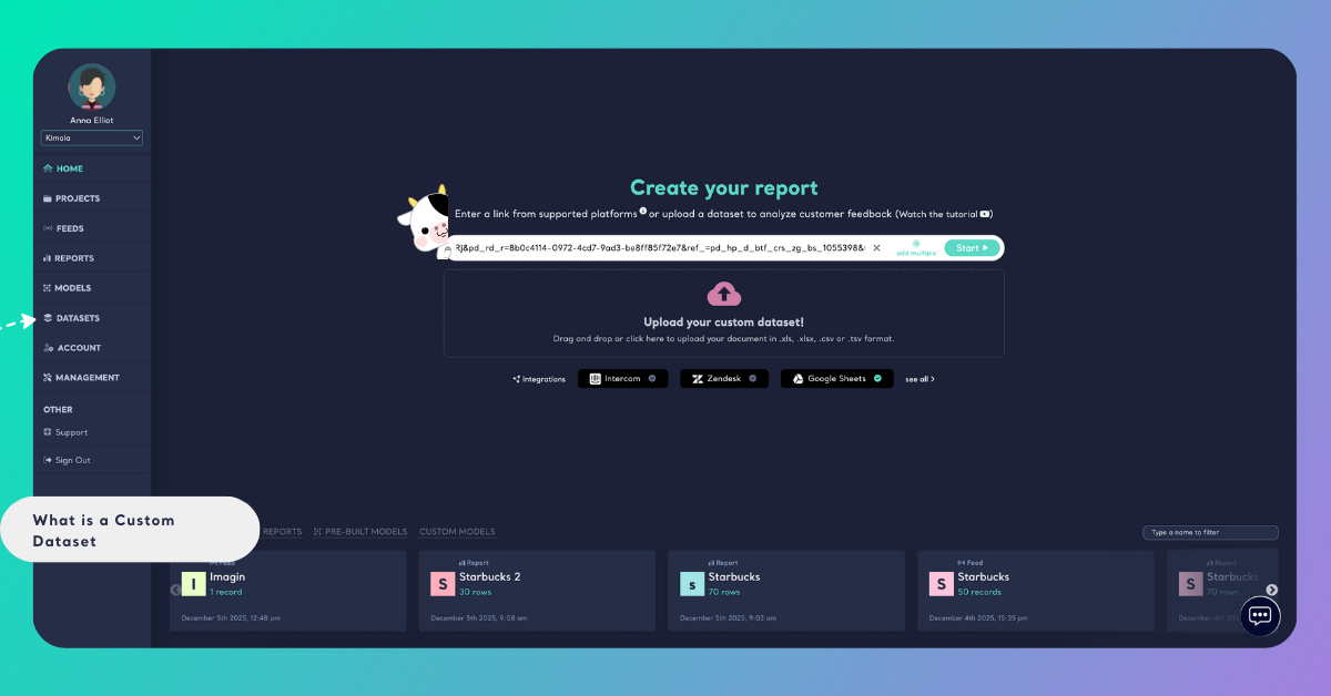 Custom Datasets act as the foundation of your analysis. They contain the original feedback, reviews, survey answers, or any text content you plan to use later.