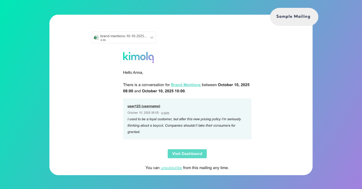 Mailings keep teams informed without needing to log in to Kimola. They save time, reduce manual checking, and ensure important mentions, reviews, or news reach the right people on schedule.